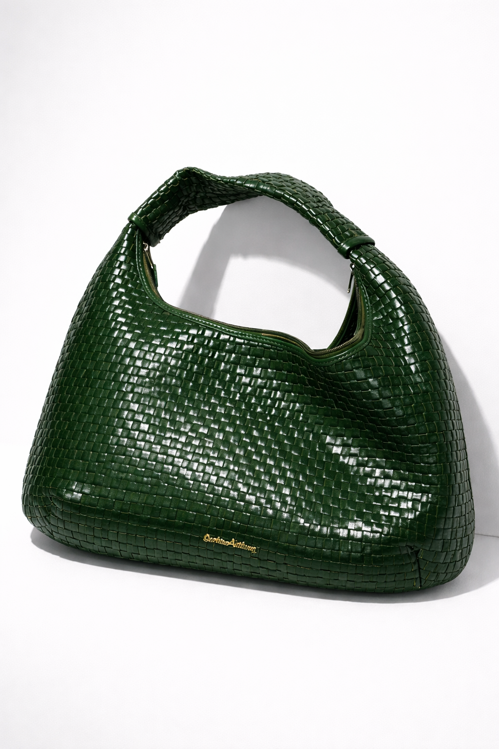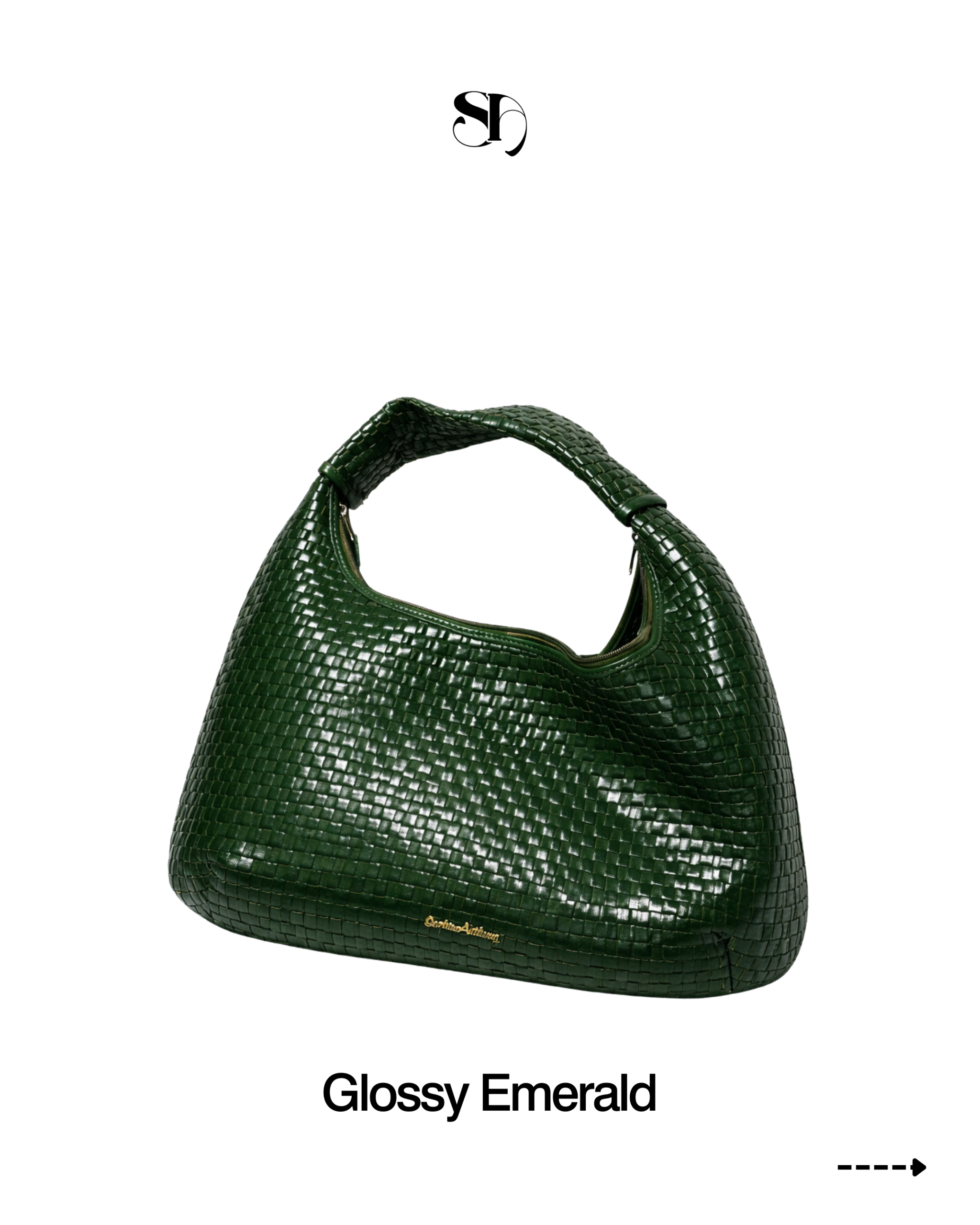 Crafted in rich emerald green glossy cowhide, this woven silhouette is defined by its dimensional texture and fluid structure. The intricate hand-woven pattern reflects light beautifully, adding depth, movement, and quiet statement appeal to an elevated everyday bag.
