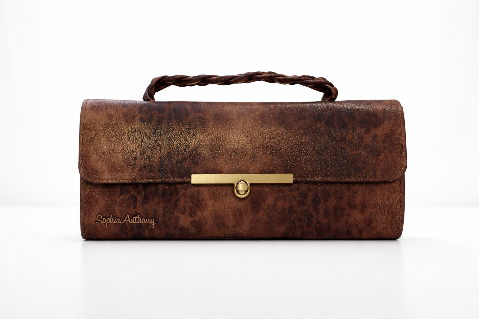 A structured mini clutch crafted in soft skin hide print with a braided top handle and signature SA metal bar clasp. Compact, elegant, and designed to elevate any look.